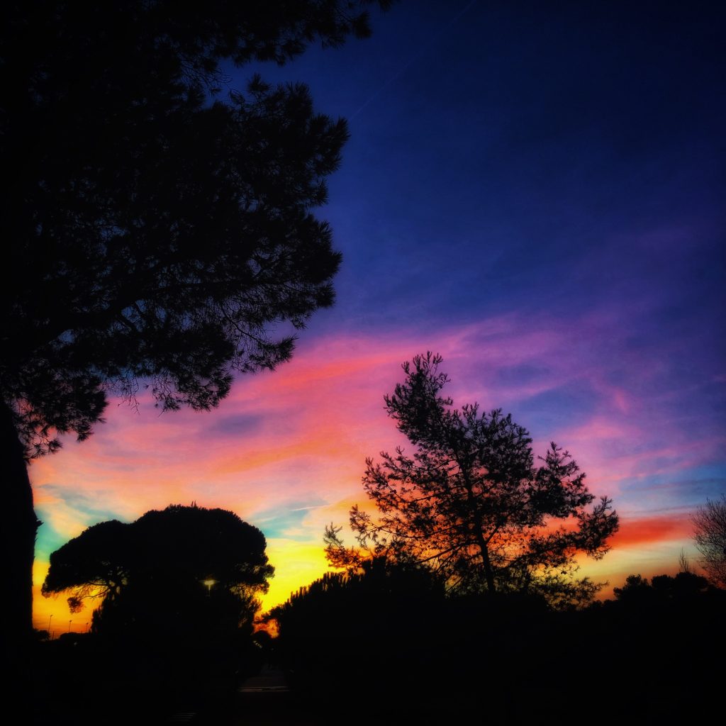 Não. Não sei. Não faço ideia! Que sortilégio aconteceu hoje com o pôr do Sol?! Que não pude assistir na praia, mas que assisti entre os ramos das árvores no Parque. E vi também as cores do céu. Como nunca tinha visto antes.