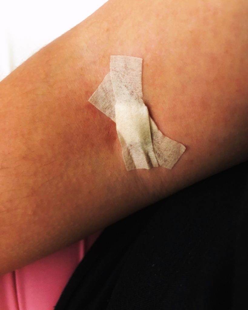 Análises feitas. E após converseta com a moça da clínica que há anos me pica as veias e que não me punha a agulha no braço há muito tempo porque ultimamente a enxurrada de análises era feita no hospital, chegou a hora do penso rápido no braço. E não posso deixar de achar curiosa a forma como ela me colou os pensos…em cruz. Como quem diz que já chega. Dêem descanso a estas veias…