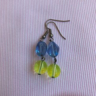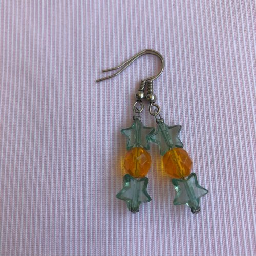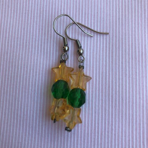 Brincos com estrelas amarelas em acrílico e conta central verde em vidro trabalhado.