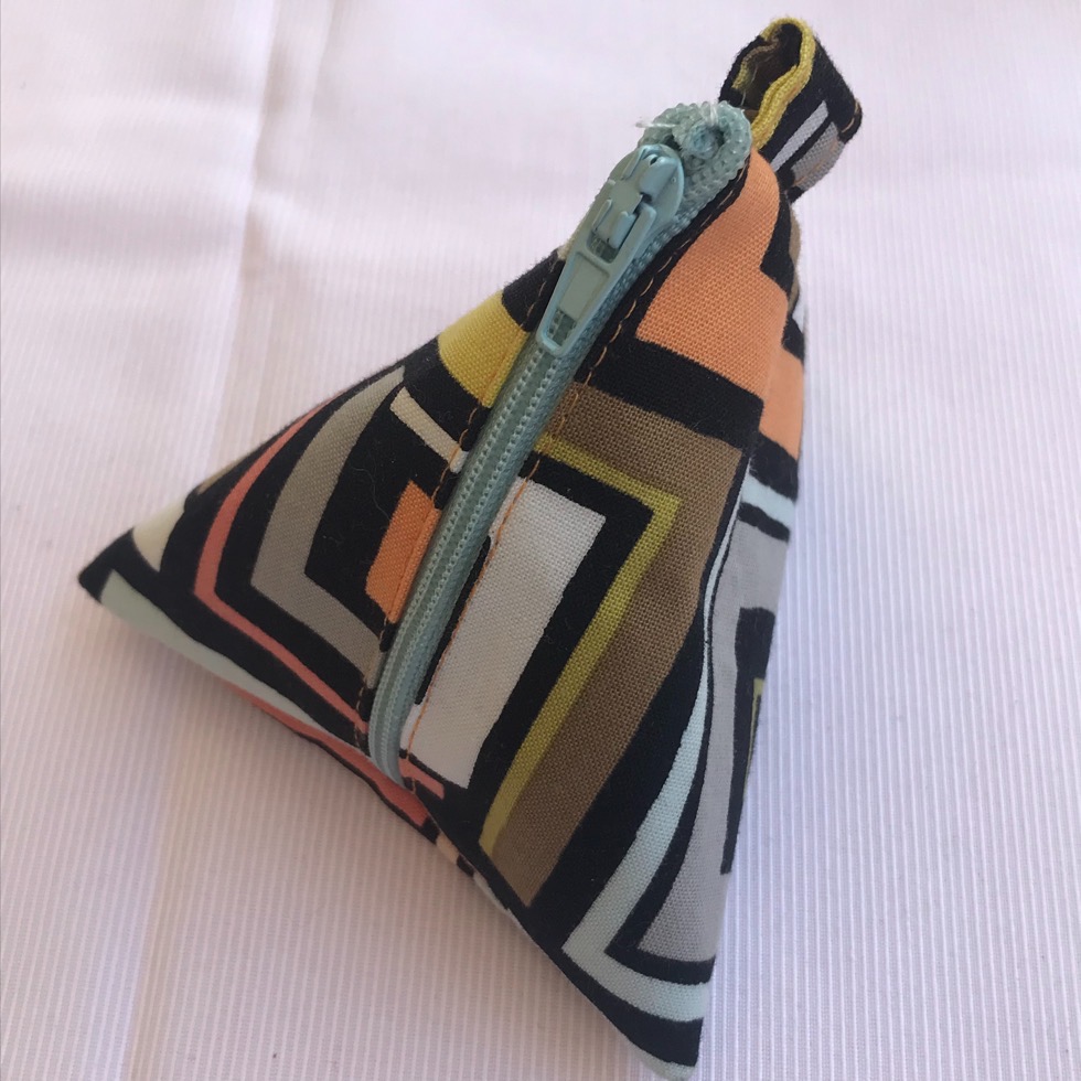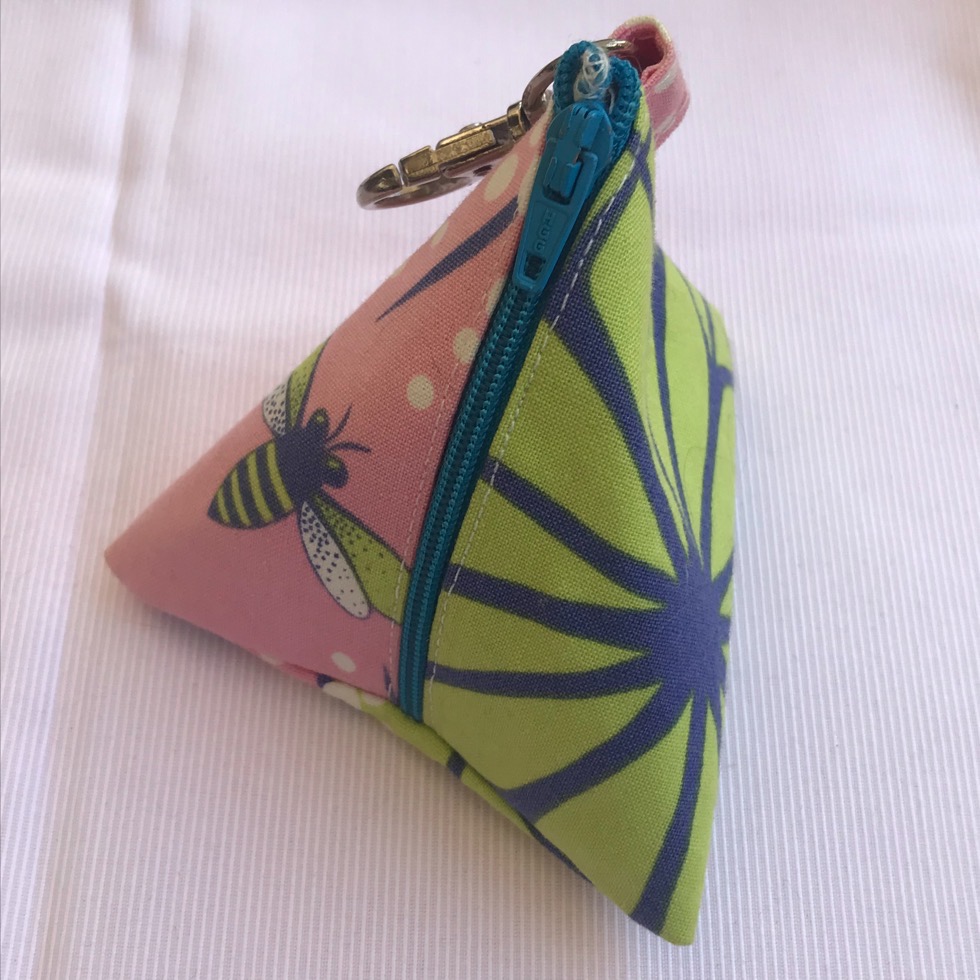 Bolsa porta-moedas em formato pirâmide, com mosquetão para porta-chaves.